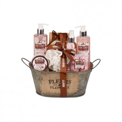 Sprchový gel 300ml, Pěna do koupele 300ml, Tělový sprej 140ml, Tělové mléko 120ml, Koupelová sůl 200g, 4ks solí do koupele-koule po 20g, Dekorativní vana (25x15x14cm).