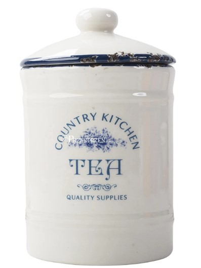 Keramická dóza na čaj, z kolekce National Trust Country Kitchen, v bílé barvě s modrým okrajem zdobeným květinovým motivem. Nádoba je záměrně zestárlá a jakékoli nesrovnalosti nepředstavují vadu produktu.