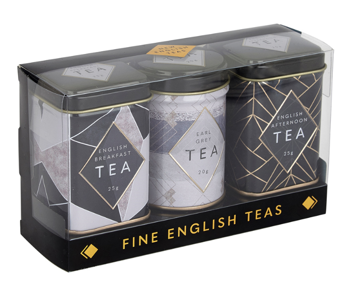 Tato stylová trojitá dárková balení čajové plechovky ve stylu Art Deco M ini obsahují řadu našich chutných sypaných anglických čajů, z nichž každý je klasickou bohatou, hladkou a lahodnou směsí. Tradičně popíjené ráno, se snídaní nebo odpoledne se sendviči a pečivem, to jsou 3 chutné nálevy, které si můžete vychutnat samotné, s plátkem citronu nebo s přídavkem mléka a případně s trochou cukru. Ideální pro sdílení s přáteli. Ideální dárek pro svatby, narozeniny, čajové dýchánky, skvělé večírky s tématikou Gatsby a výročí. Tyto dělají skvělé svatební laskavosti.