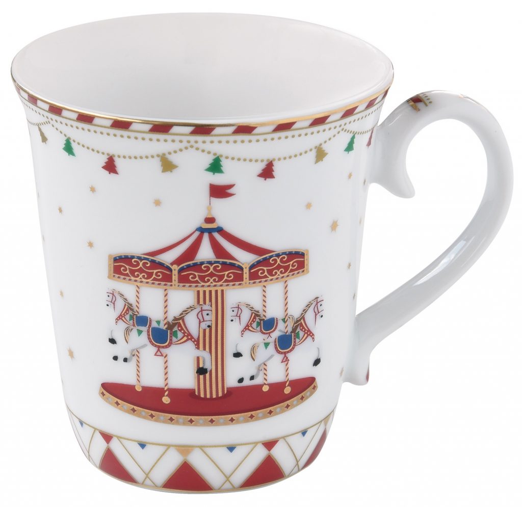 Porcelánový hrnek Christmas Wonderland s motivem kolotoče a se zlatou linkou. Hrnek je o objemu 275 ml a je zabalen v dárkové krabičce stejného motivu.