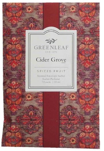 Ovocná trojice vůně jablek, ostružin a pomerančové kůry se mísí s hřejivým kořením skořice a muškátového oříšku a připomíná tak vůni čerstvě upečeného lahodného koláče. Vonný sáček Cider Grove je naplněný vonnou směsí a nabízí několik možností použití. Můžete jej uložit do šatní skříně a provonět své prádlo, vhodný též do kabelky, auta a podobně. Vysypete-li jeho obsah na podlahu a následně vysajete vysavačem, budete si tuto vůni připomínat při každém dalším úklidu. Vonný sáček lze též doplnit vonnými svíčkami či difuzéry se stejnou vůní z nabídky Greenleaf.
