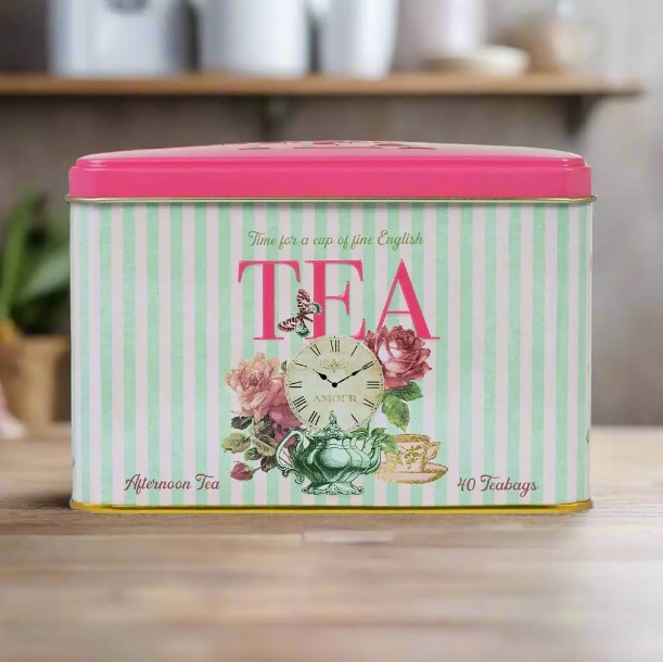 Naše klasická čajová dóza Time For Tea s vintage motivem se vyznačuje výrazným designem, který zahrnuje krásně elegantní ilustrace květin, hodin, motýlů a šálků na vintage proužkovaném pozadí. Retro design dotváří klasická výrazná typografie v kombinaci s výraznou barevnou paletou. Tato dóza je uzavřena víkem s výklopným odklopením a zdobena reliéfními detaily. Obsahuje také 40 našich charakteristických čajových sáčků English Afternoon.